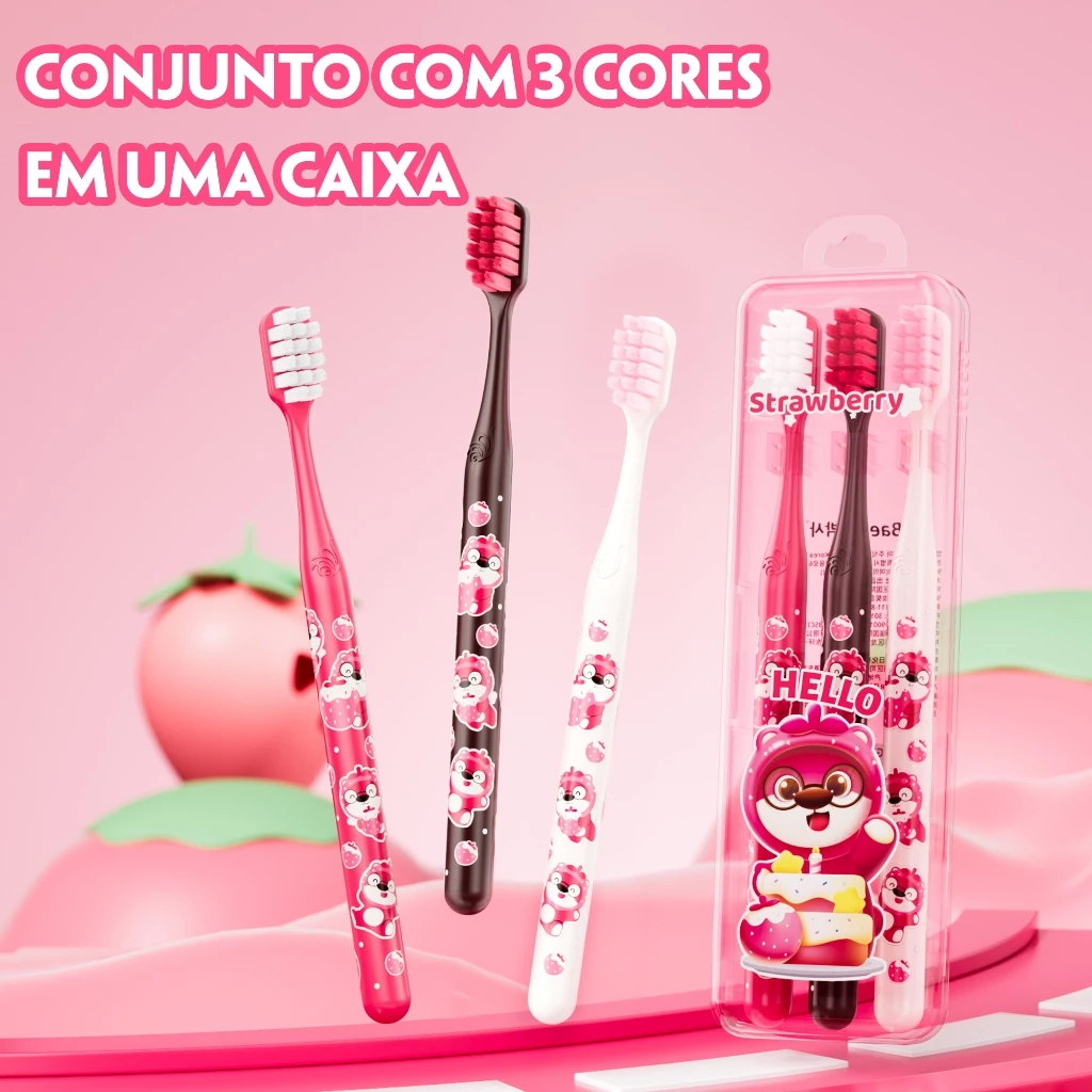 ESGOTADO- Dr.Baek Escova de dentes com cerdas macias, design Strawberry Bear,Kit 3 Cores,Viagem/Uso doméstico- KR107