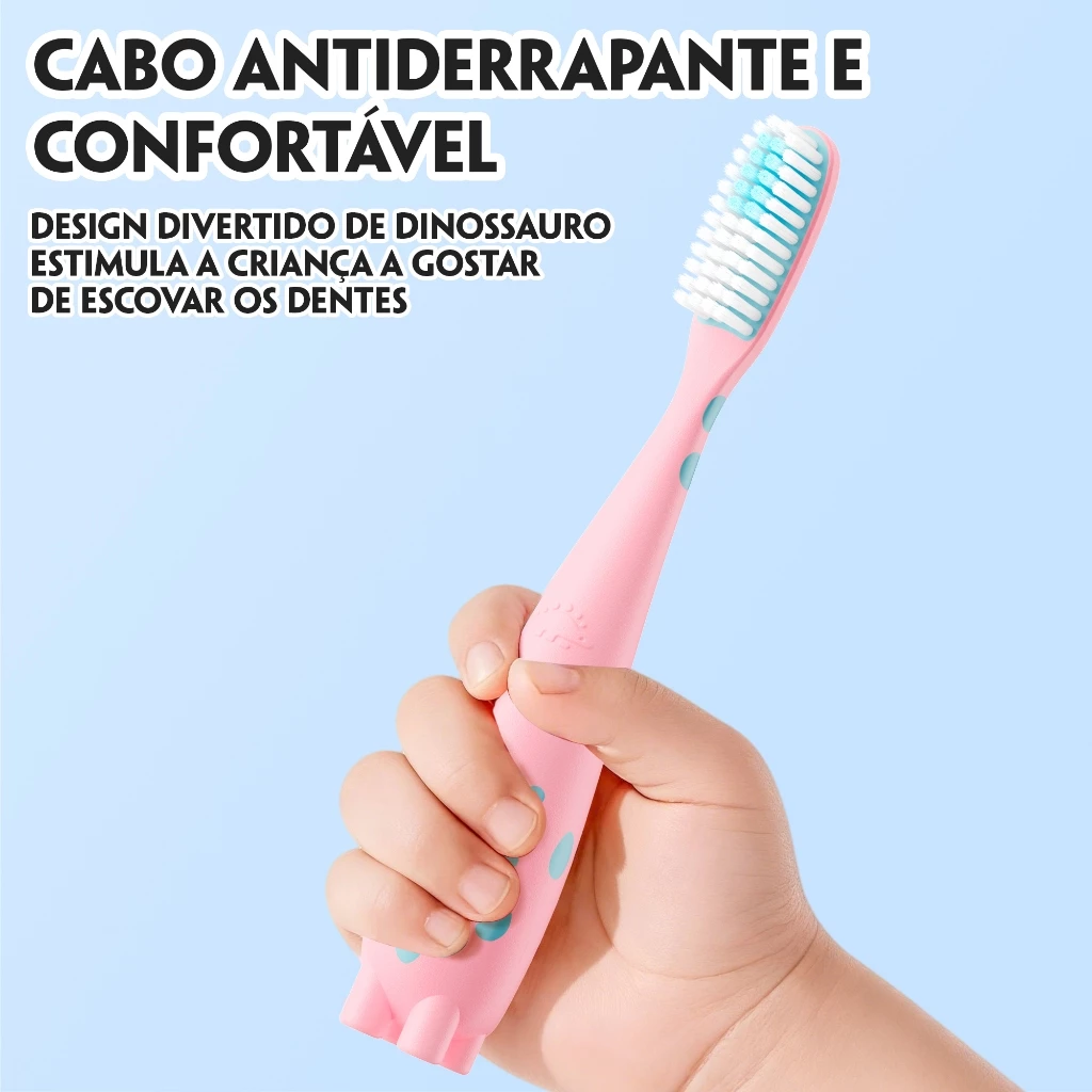 Seu grande diferencial começa pelo design em formato de dinossauro, pensado para encantar e estimular o interesse da criança. O visual lúdico faz com que ela tenha mais vontade de escovar os dentes, tornando o processo mais natural e menos resistente. O cabo ergonômico e antiderrapante foi projetado para se encaixar confortavelmente nas pequenas mãos, oferecendo firmeza e segurança durante o uso.