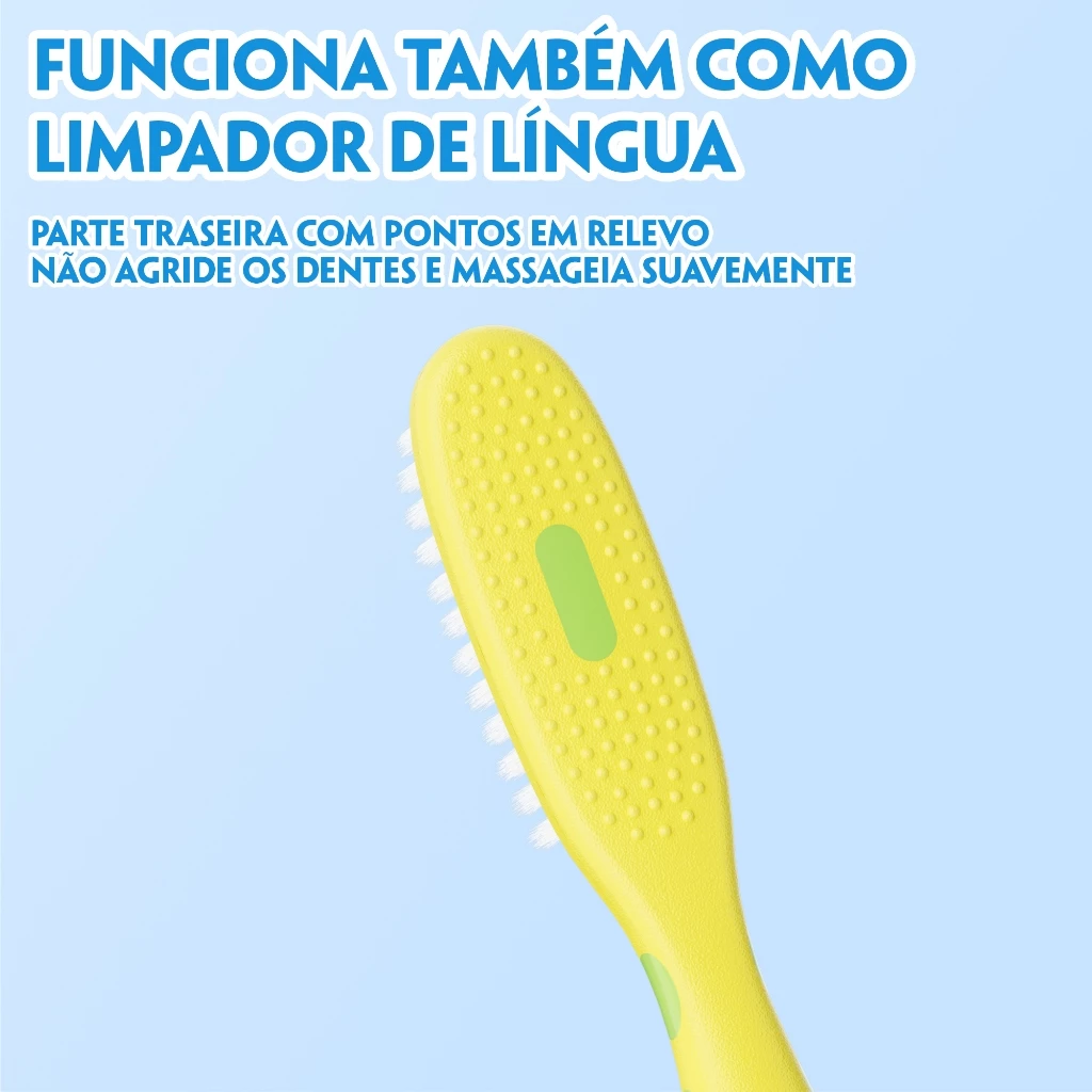Além disso, possui limpador de língua integrado na parte traseira da cabeça, com pontos macios em relevo que auxiliam na remoção de resíduos e ajudam no combate ao mau hálito de forma suave.