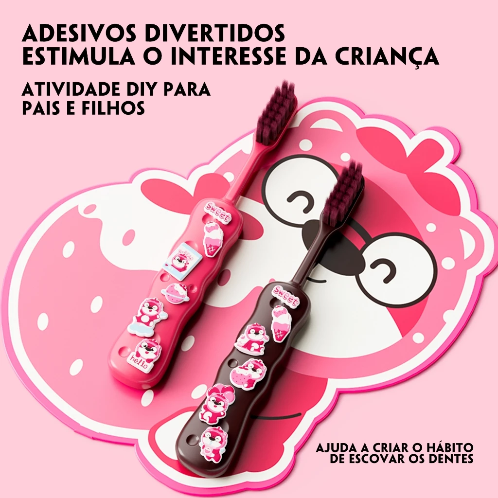 O kit contém 2 escovas em cores vibrantes — marrom escuro e rosa brilhante, permitindo que as crianças escolham sua favorita e tornando o momento da escovação ainda mais agradável. É uma ótima opção para uso diário em casa, durante o período de troca de dentes, para incentivar a higiene bucal em escolas ou creches, e também como presente temático para crianças.