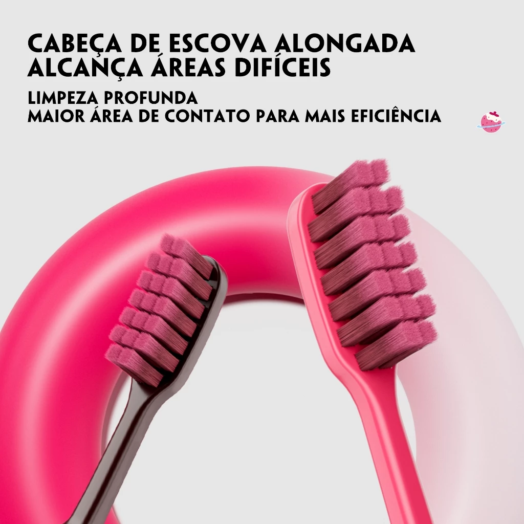 A escova possui cabeça alongada, projetada para alcançar facilmente os espaços entre os dentes e as áreas posteriores da boca, onde normalmente ocorre maior acúmulo de placa bacteriana. Esse formato permite uma limpeza mais completa e profunda, ajudando a remover resíduos alimentares e evitando o problema de “limpeza incompleta” comum em escovas tradicionais.