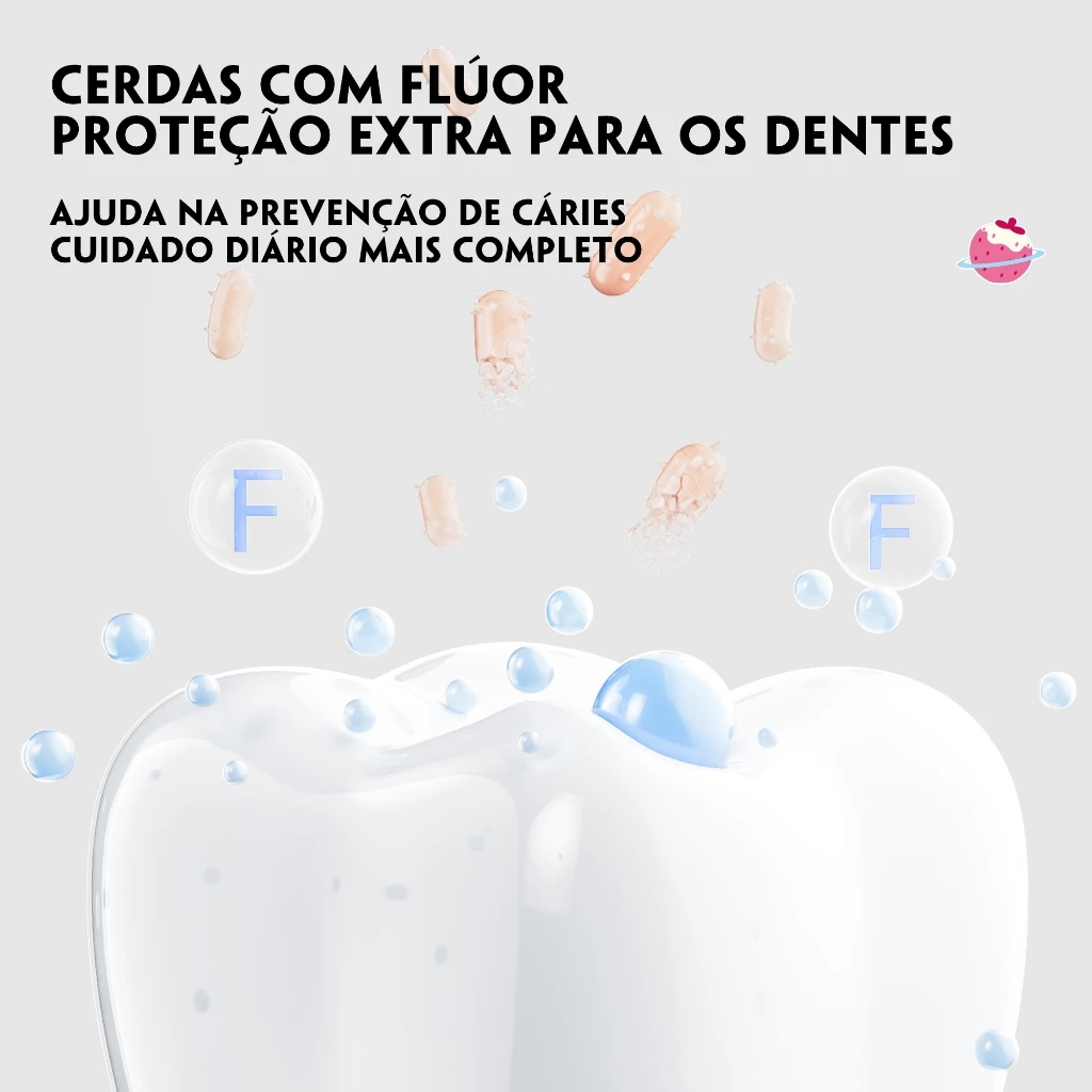 O grande destaque da escova está nas cerdas ultrafinas de 0,1 mm com flúor, que ajudam a limpar profundamente os dentes enquanto protegem as gengivas delicadas das crianças. Essas cerdas são suaves e elásticas, proporcionando uma escovação confortável e eficaz. Além disso, o flúor presente nas cerdas ajuda a formar uma camada protetora nos dentes, contribuindo para a prevenção de cáries e promovendo uma melhor saúde bucal desde cedo.