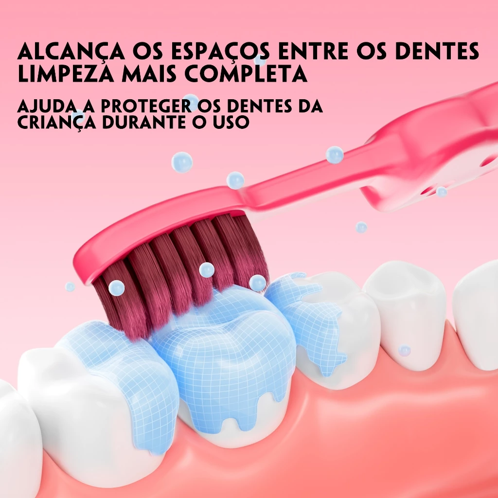 O cabo ondulado antiderrapante foi projetado para se adaptar facilmente às mãos pequenas das crianças, oferecendo uma pegada confortável e segura. Esse design facilita o controle durante a escovação, ajudando as crianças a desenvolverem autonomia na higiene bucal.