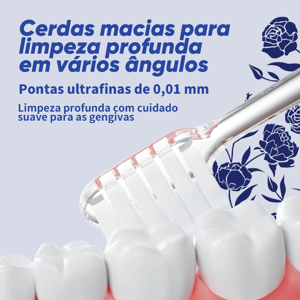 Um dos principais destaques são as cerdas ultrafinas de 0,01 mm, projetadas para realizar uma limpeza profunda sem causar desconforto às gengivas. Sua estrutura delicada permite alcançar com facilidade os espaços entre os dentes, removendo resíduos alimentares e placa bacteriana de forma eficiente, sendo também adequada para pessoas com gengivas sensíveis.