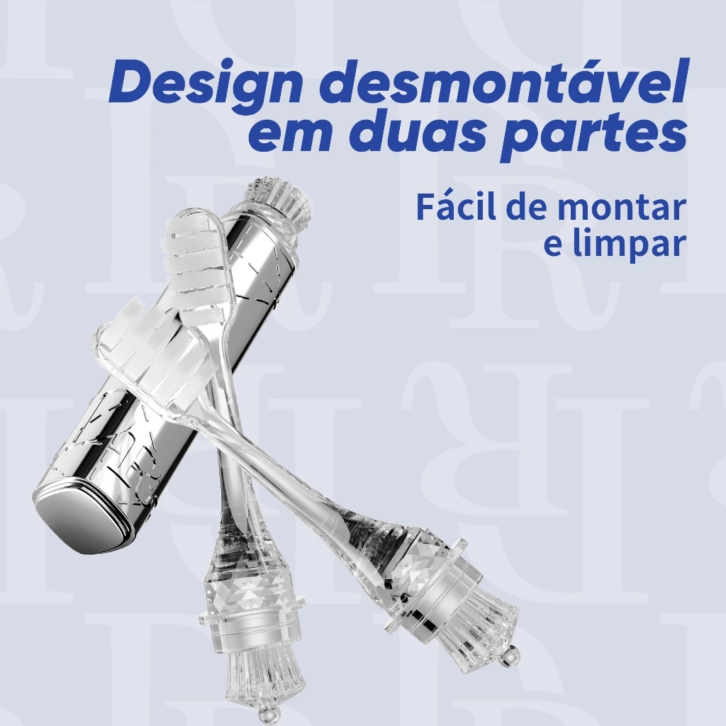 A escova possui design desmontável em duas partes, permitindo a separação do cabeçote por meio de um simples giro. Esse sistema facilita a higienização completa do produto, contribuindo para uma rotina de cuidado bucal mais segura e higiênica, além de ajudar a evitar o acúmulo de bactérias.
