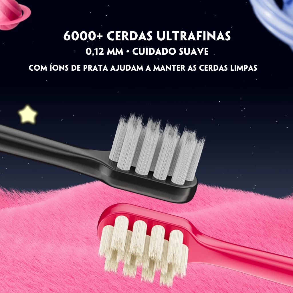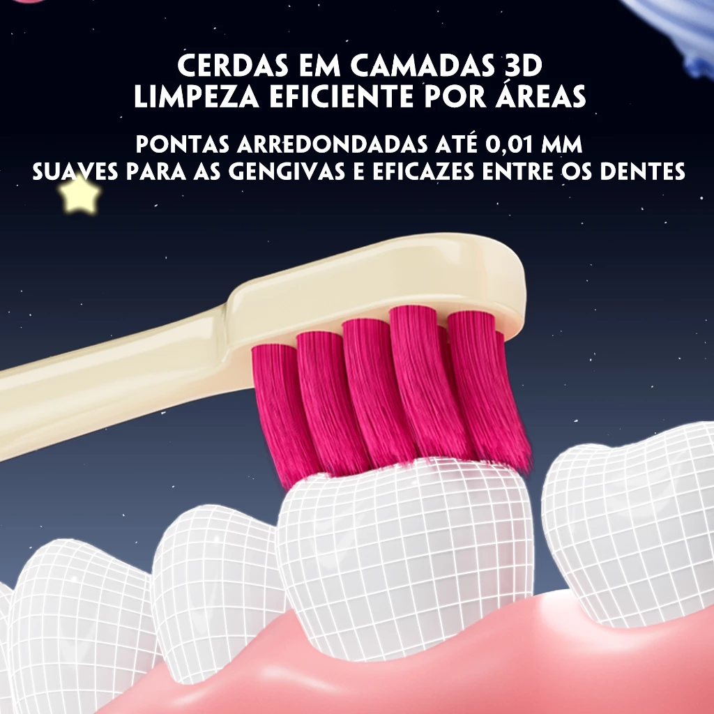 A escova possui mais de 6.000 cerdas ultrafinas que limpam suavemente sem machucar as gengivas sensíveis das crianças, enquanto as pontas arredondadas de apenas 0,01 mm protegem os dentinhos em crescimento. Para maior higiene, as cerdas contam com íons de prata, ajudando a manter a escova limpa por mais tempo.