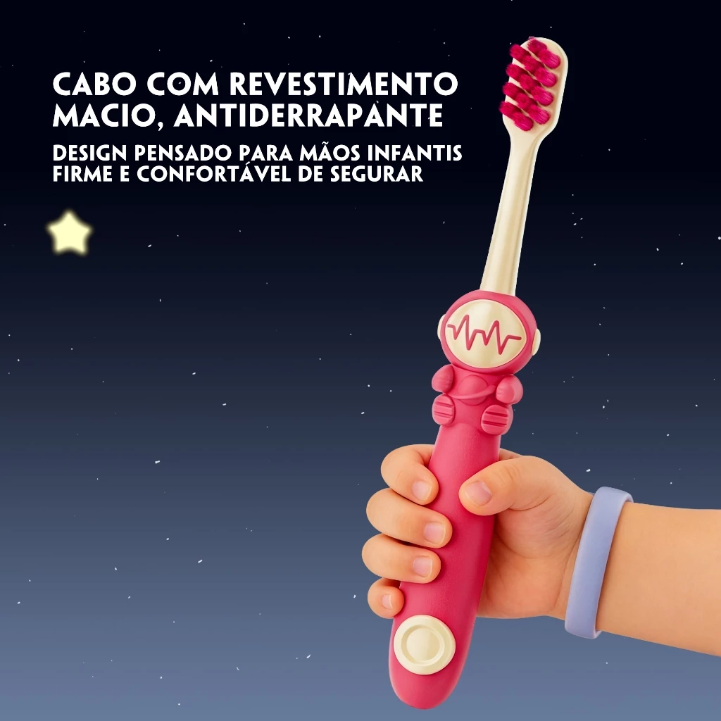 O cabo macio, leve e antiderrapante foi desenvolvido para mãos pequenas, garantindo segurança, firmeza e controle durante a escovação, evitando quedas ou acidentes. Além disso, o raspador de língua integrado e a cabeça de 3 lados proporcionam uma limpeza completa, abrangendo todos os dentes e superfícies, promovendo cuidado bucal eficaz e suave.