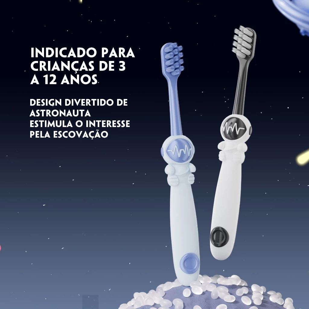 Desenvolvida especialmente para crianças de 3 a 12 anos, essa escova transforma a rotina de higiene bucal em uma verdadeira aventura espacial, incentivando hábitos saudáveis desde cedo, com tecnologia e diversão combinadas em um só produto. O design em forma de astronauta, nas cores azul e branco, encanta meninos e meninas, tornando a escovação um momento lúdico e esperado.