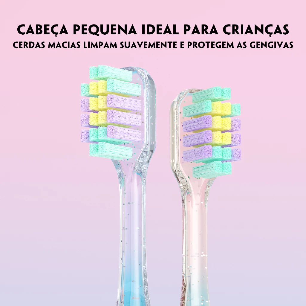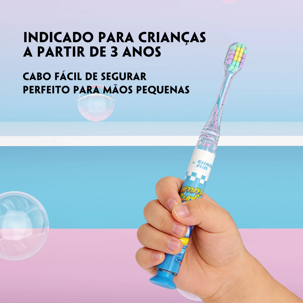 O design foi pensado especialmente para o público infantil. A cabeça pequena e arredondada se adapta perfeitamente à boquinha da criança, alcançando todos os dentinhos com conforto e segurança. As cerdas extramacias promovem uma limpeza eficiente sem agredir as gengivas sensíveis nem o esmalte dental em formação, oferecendo cuidado delicado durante essa fase tão importante do desenvolvimento.