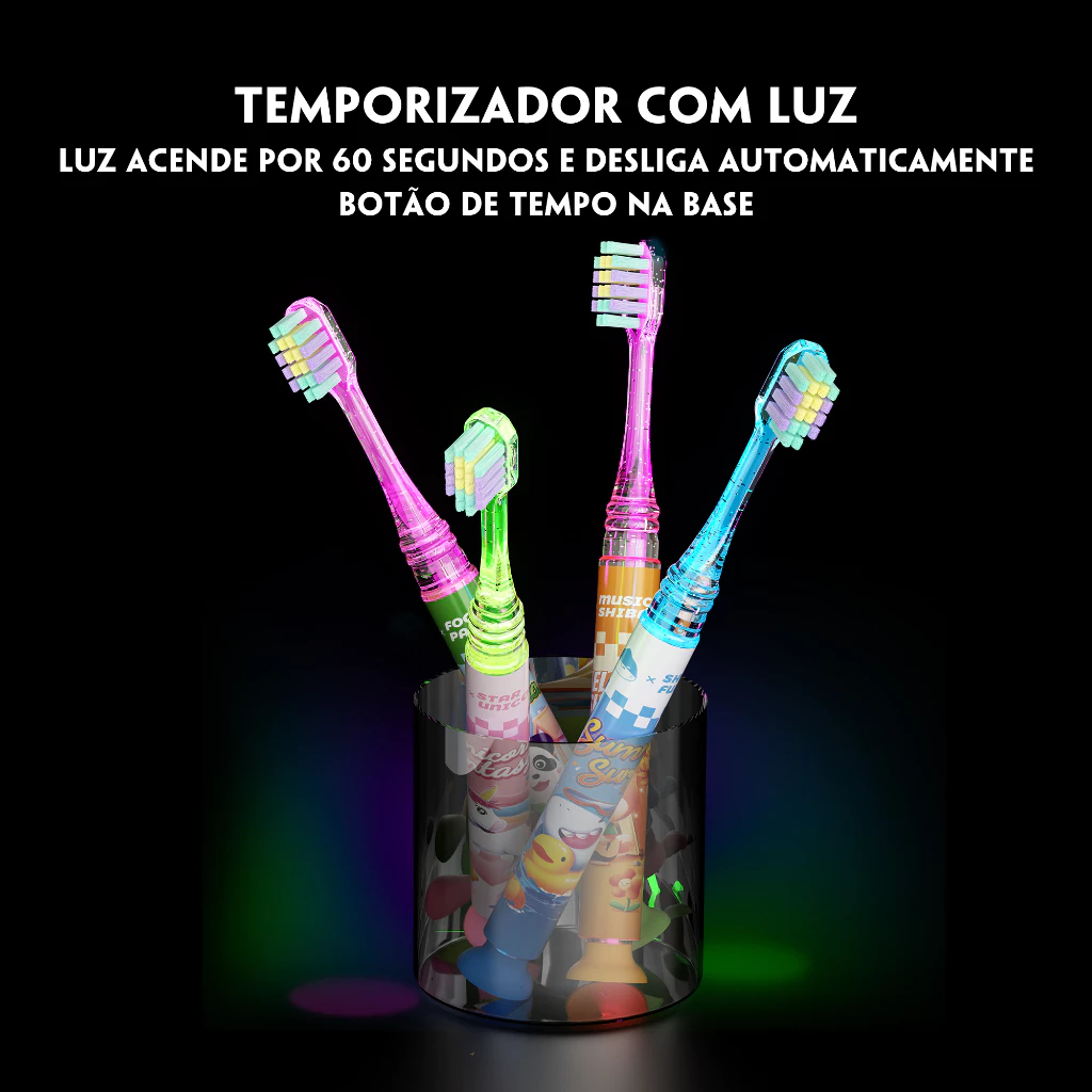Um dos seus grandes diferenciais é o timer de luz educativo de 60 segundos. Ao pressionar o botão localizado na base, a luz é ativada e permanece acesa por 1 minuto, apagando automaticamente ao final da contagem. Esse recurso visual ajuda a criança a entender, de forma simples e lúdica, quanto tempo deve dedicar à escovação. A recomendação é escovar os dentes superiores por 60 segundos e os inferiores por mais 60 segundos, completando os 2 minutos indicados por dentistas de maneira prática e fácil de acompanhar.
