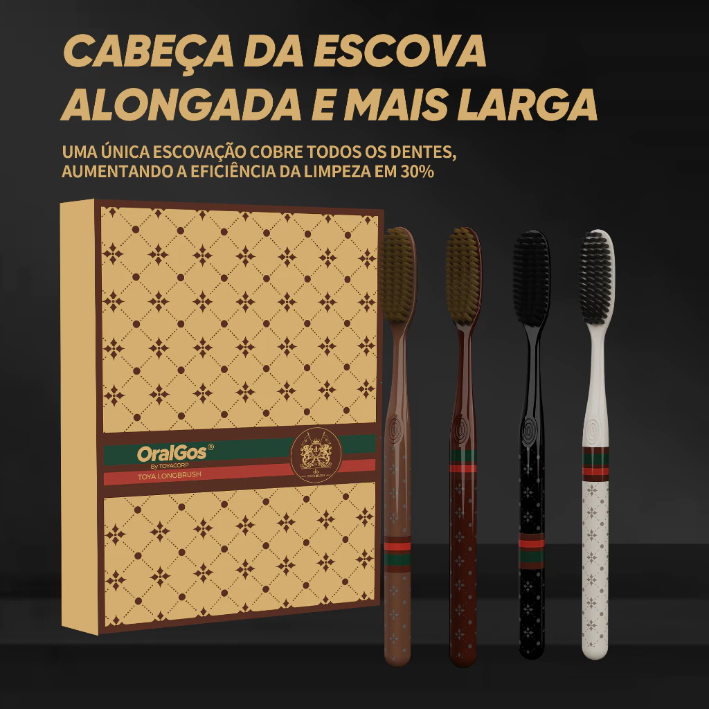 A OralGos TOYA LONGBRUSH é a escova premium que transforma a escovação diária em eficiência e estilo. Com cabeça alongada de 4,5 cm, cerdas cônicas ultrafinas de 0,01 mm e design curvo, limpa metade da arcada dentária em uma única passada, oferecendo +30% de eficiência. Seu kit vem com 4 cores sofisticadas, ideal para adultos que valorizam cuidado, proteção gengival e sofisticação no banheiro.