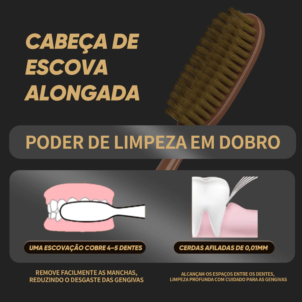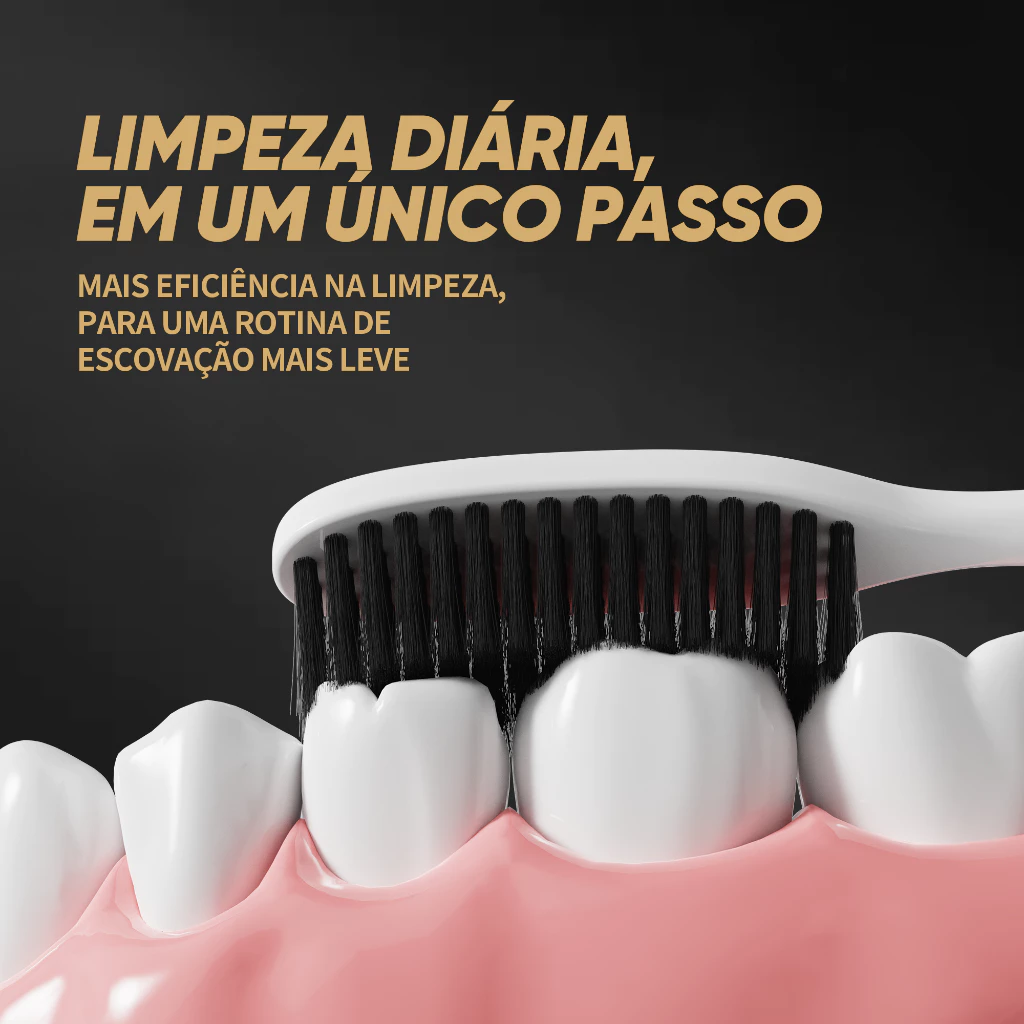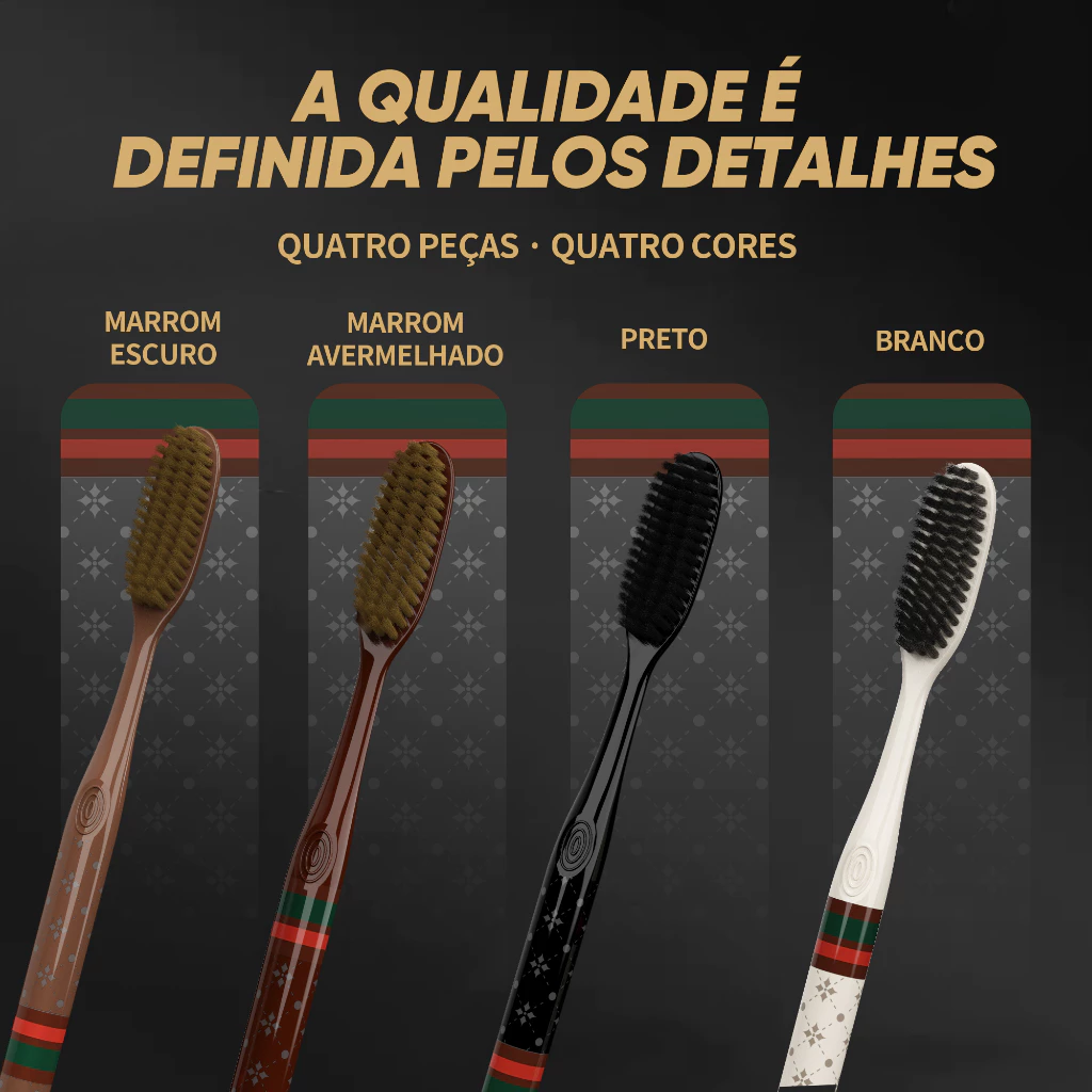 O kit inclui 4 escovas em cores elegantes: Marrom Escuro, Marrom Avermelhado, Preto e Branco, oferecendo variedade e estilo para toda a família. Cada escova possui cabeça de 4,5 cm e cerdas de 0,01 mm, combinando eficiência, proteção gengival e design refinado.