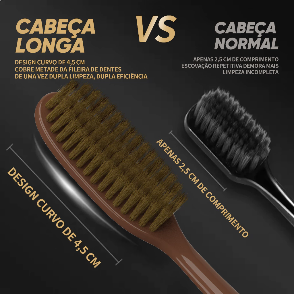A OralGos TOYA LONGBRUSH é a escova que transforma a rotina de higiene bucal em eficiência, cuidado e sofisticação. Diferente das escovas tradicionais de cabeça curta (2,5 cm), que cobrem apenas 2–3 dentes e exigem movimentos repetitivos, a TOYA LONGBRUSH possui cabeça alongada de 4,5 cm e design curvo, permitindo limpar metade da arcada dentária de uma única vez. Com eficiência comprovada +30%, ela reduz o tempo de escovação e garante resultados superiores em cada passada.