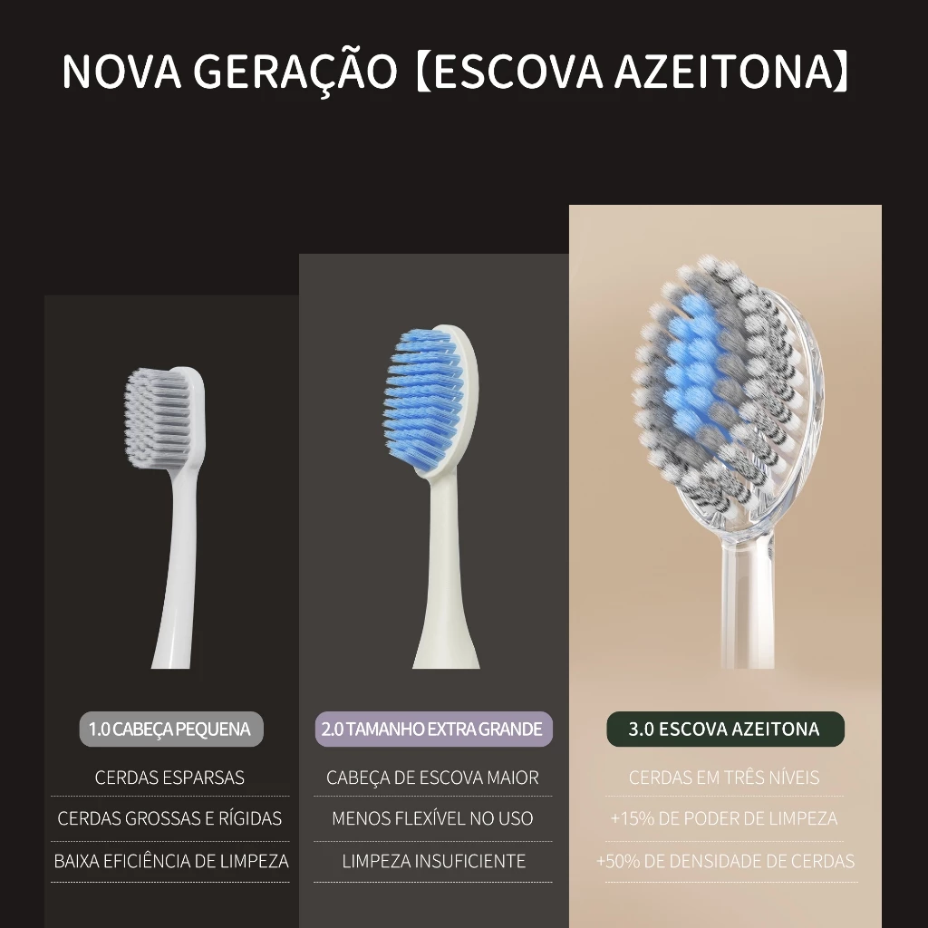 O formato “Azeitona” 3.0 oferece equilíbrio entre tamanho e flexibilidade, combinando a agilidade das cabeças compactas com a cobertura das cabeças maiores. Seu design arredondado permite alcançar todos os dentes, inclusive os posteriores, com maior controle e conforto durante a escovação.
