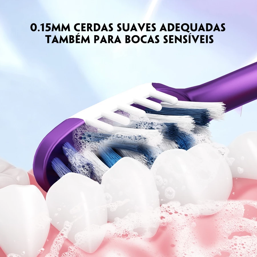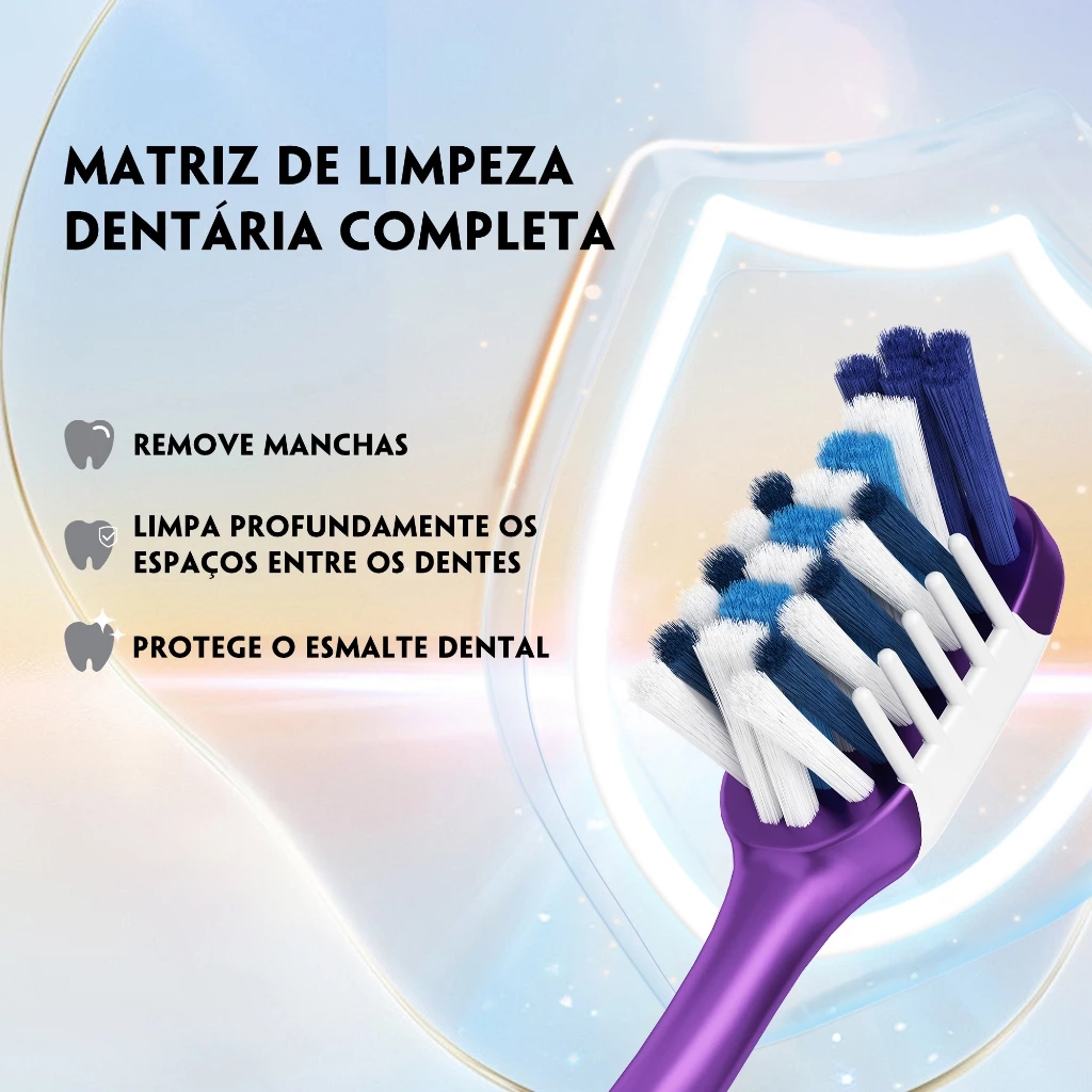 O principal diferencial está na Tecnologia Wave Matrix, uma matriz de cerdas dispostas em formato de onda, fabricadas com diâmetro ultrafino de 0,15 mm. Essa configuração permite que as cerdas se adaptem dinamicamente aos contornos naturais dos dentes, alcançando superfícies visíveis, regiões interdentais e áreas de difícil acesso, favorecendo a remoção eficaz de resíduos e placa bacteriana.