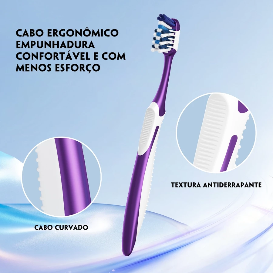 O cabo ergonômico com curva anatômica foi projetado para oferecer uma pegada confortável e estável. Sua textura antiderrapante auxilia no controle dos movimentos, exigindo menor esforço durante a escovação e proporcionando uma experiência mais confortável e contínua.