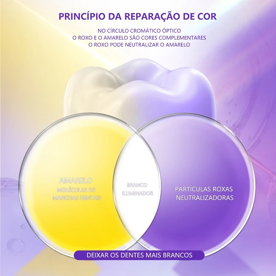 O funcionamento baseia-se no princípio da neutralização óptica, fundamentado na teoria das cores complementares. As partículas violetas interagem com pigmentações superficiais, promovendo um efeito visual corretivo que contribui para uma aparência mais uniforme, luminosa e limpa do sorriso.