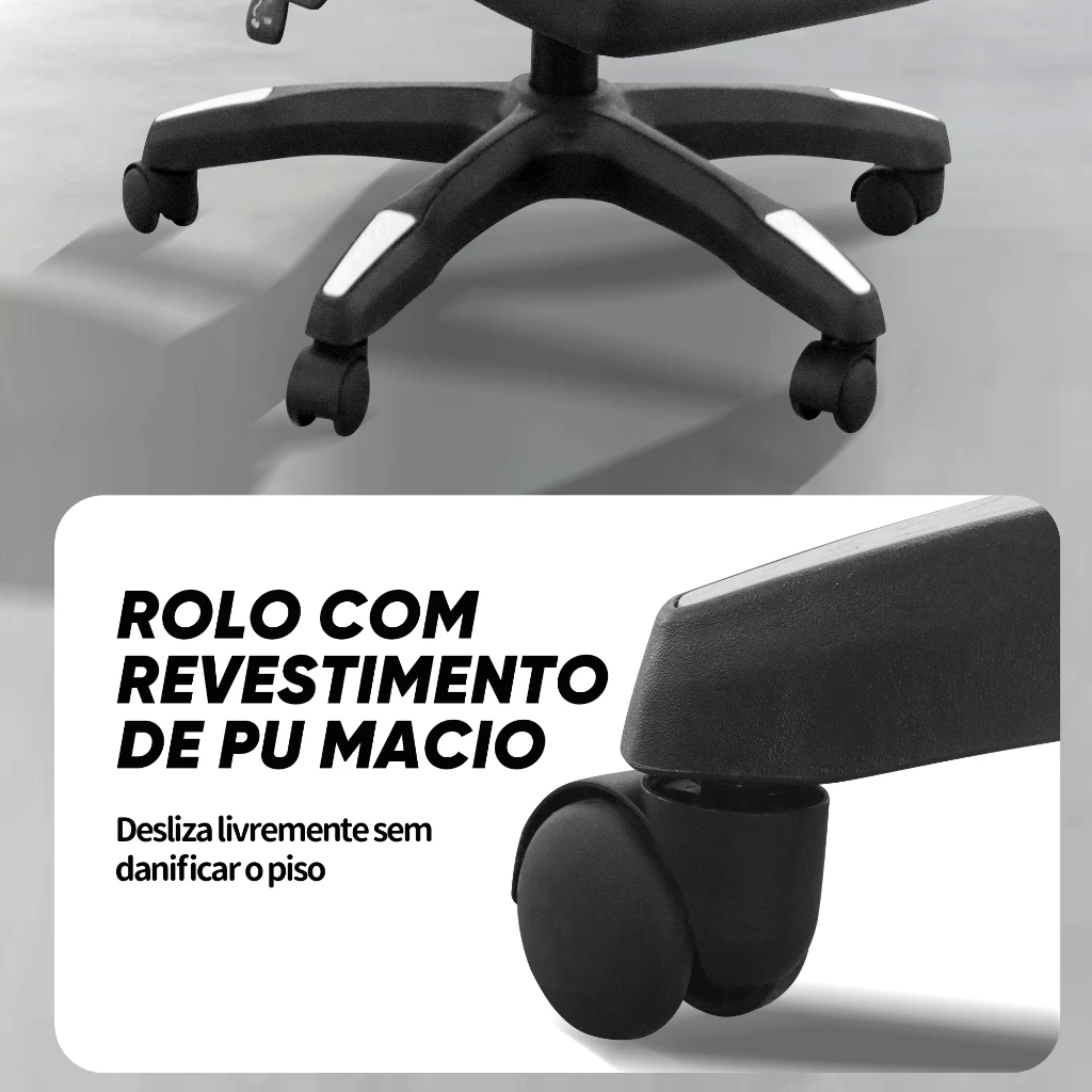 As rodas de PU macio garantem mobilidade fluida sem ruídos e não arriscam o piso — perfeitas para ambientes corporativos e home office.